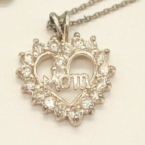 Sterling Silver Mom Heart Necklace 20" 925 CZ Cluster Pendant and Chain