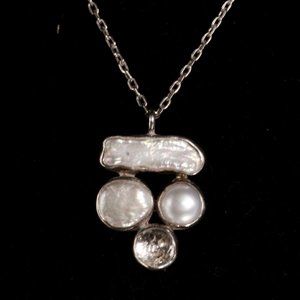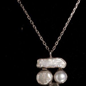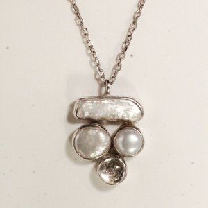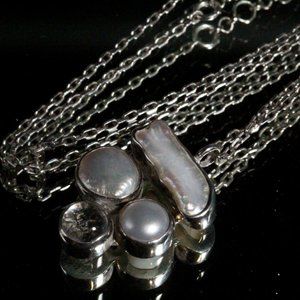 This is a contemporary necklace featuring a stunning pendant crafted from a combination of Mother of Pearl and Quartz stone set on a sterling silver metal base. The pendant is uniquely shaped and exquisitely designed, measuring 1 3/8" by 7/8". The chain is also made of sterling silver, measuring 16 1/2" long, and has a spring ring clasp for easy and secure fastening. This modern necklace is marked with "925" and is in excellent condition with only slight tarnishing, adding to its overall charm and character. With a weight of 11 grams, this necklace is lightweight and comfortable to wear for extended periods. The perfect accessory to add a touch of elegance and sophistication to any outfit.