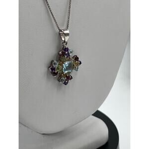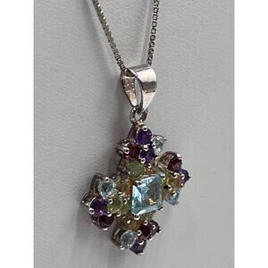 Sterling Silver Multi Color Gemstones Signed Cross Pendant Necklace Garnet Topaz