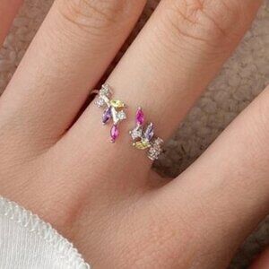 Elegant sterling silver ring featuring vibrant pink, purple, and yellow gemstones. Perfect for adding a touch of color to any outfit. Great expandable open face cuff style ring.