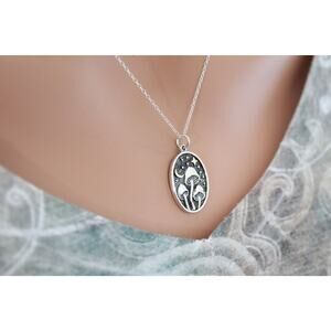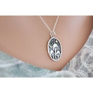 This is Sterling Silver Mushroom Pendant with Bronze Star and Moon Charm Necklace. Both the charm and the necklace are Sterling Silver. This charm comes on an 18 inch chain.