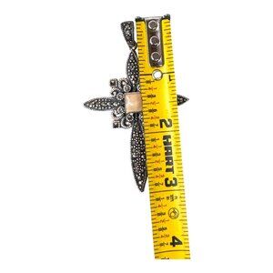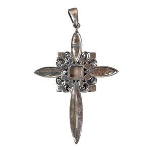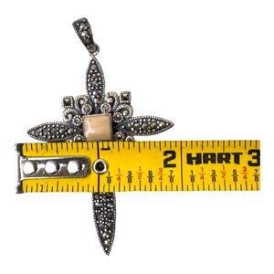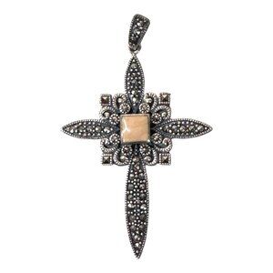 Elevate your jewelry collection with this exquisite sterling silver cross pendant. Adorned with marcasite stones and a central mother of pearl inlay, this piece offers a touch of elegance and sophistication. Its intricate detailing makes it a standout accessory for those who appreciate unique craftsmanship.