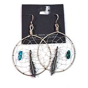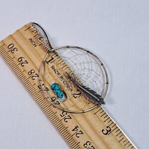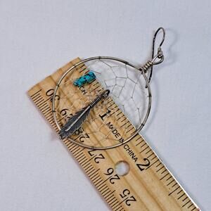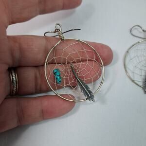 Sterling Silver Native American Dream Catcher Earrings Feather Turquoise Dangle.