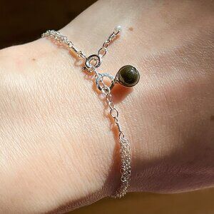 A dainty handmade bracelet with delicate layered cable chain and a removable natural jade sliding charm. Other gemstone charms are available upon request. This bracelet is adjustable and the extender is finished with a tiny freshwater seed pearl. The charm can slide around the bracelet, which makes this the perfect fidget bracelet for anxiety.