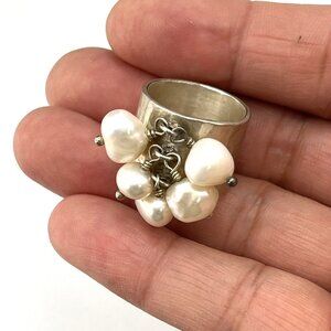 Sterling Silver & Natural Pearl Wide Band Cha Cha Ring Size 6.5