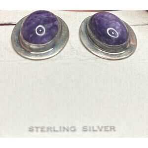 Sterling Silver Natural Purple Charoite Oval Cabochon Bezel Set Stud Earrings