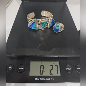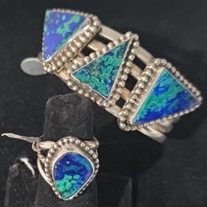 Sterling Silver Navajo Cuff Bracelet & Ring Set Signed Azurite Stones