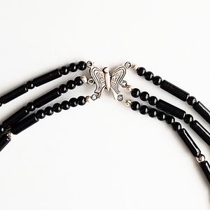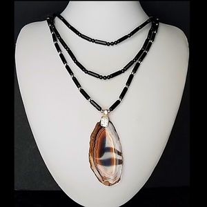 Designed by D.Leigh, this necklace is rich looking with the sterling silver bale holding the Brazilian agate. Sterling silver beads in between the black onyx really set off the striking beauty of this necklace. Sterling silver butterfly clasp brings this 3 strand necklace together that is drop dead gorgeous.