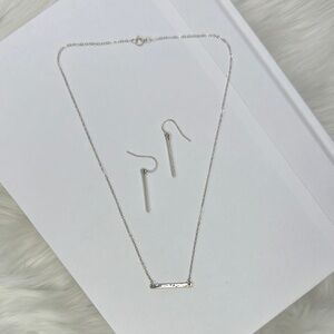 This sterling silver necklace and earring set adds a touch of sophistication to any outfit. Perfect for any occasion. Slightly hammered detail on the bar. Necklace marked 925 MSCO. Earrings marked 925. Necklace is 16”. Bar is 1” on both pieces. Total weight is 2.22g. Great used condition.