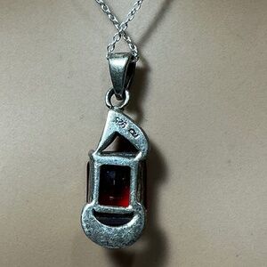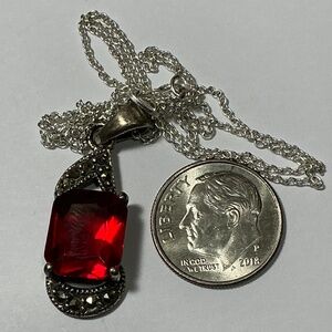 Sterling Silver Necklace with a Red Stone and Marcasite. 19.25 inches long