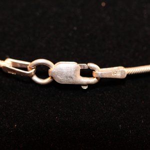 The chain is made of .925 sterling silver. The chain is 16 inches (41 centimeters). The chain clasp is known as a lobster clasp and the chain is called a snake chain.