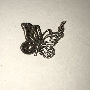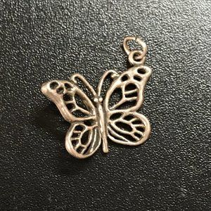 Sterling silver open wing butterfly pendant. This pendant is handmade. It hangs from one wing, but if you want we can make it so it hangs from the corner of each wing allowing it to lay flat.
