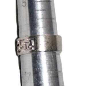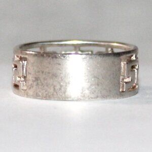 Sterling silver ring with an open work lattice like design. Ring also has some rubbing on the back which looks like the ring may be rhodium plated. The rhodium plating is there to help keep the ring from tarnishing when it's not worn.