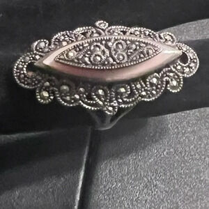 Sterling Silver Openwork Marcasite Shield and Mother of Pearl Cocoon Ring SZ 6