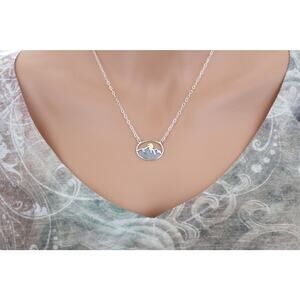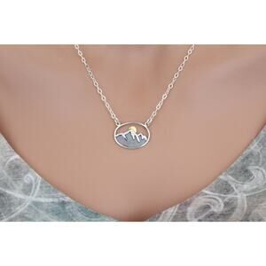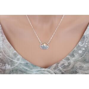 This is a Sterling Silver Oval Mountain Pendant with Bronze Sun Necklace. Both the charm and the necklace are Sterling Silver. This charm is on an 18 inch chain.