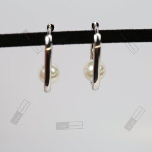 Elegant earrings featuring a sleek oval silhouette in rhodium-plated .925 sterling silver, accented with a smooth white pearl at the base.
