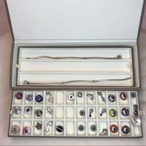 Sterling Silver Pandora Bracelets, Charms and Suede Jewelry Box.