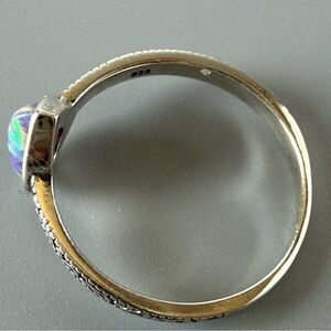 This shimmering teardrop opal ring features a vibrant fire-opal style stone set in solid sterling silver. Delicate etched band detailing adds vintage charm with a modern twist. Crafted with ethically sourced materials and coated for extra durability, it’s hypoallergenic and safe for sensitive skin.