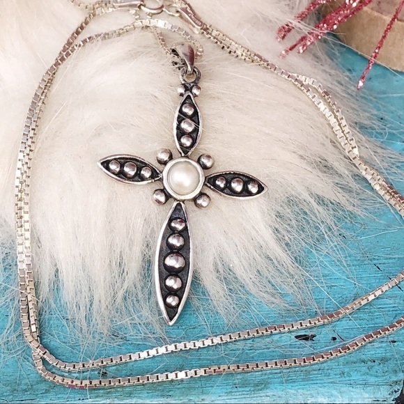 Sterling Silver Pearl Cross Necklace Marked CFJ 925, on a 20" Box Chain from Italy