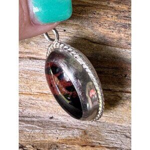 This exquisite sterling silver pendant features an oval-shaped onyx and red jasper gemstone cabochon encased in an intricately detailed silver frame. Its polished surface captures light beautifully, showcasing the natural contrast between the deep black onyx and earthy red jasper. A versatile and elegant accessory that seamlessly complements various styles.