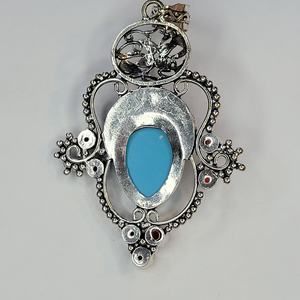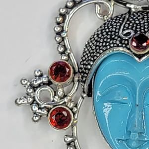 Sterling Silver Pendant with Blue Carved Face and Garnet Accents
