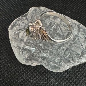 Sterling Silver, (stamped 925), Peridot Poison ring, size 8 3/4. The faceted, marquis cut stone has a brilliant green coloration with copper highlighted leaves on either side of the bezel that highlight the stone. This poison ring has a working hinge which allows for easy opening and closing and is well balanced with a thick sterling band.