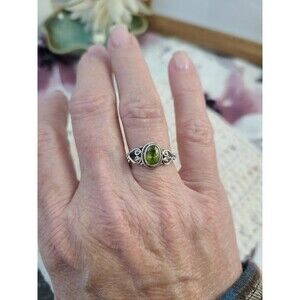 Add a pop of vibrant green with this sterling silver ring featuring an oval-cut peridot gemstone. Set in a vintage-style 925 silver band with ornate leaf and scroll detailing, this size 6 ring blends timeless elegance with artisan charm. The faceted peridot sparkles with natural brilliance, making it perfect for everyday wear or special occasions.