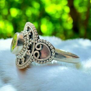 This gorgeous piece features a bezel set, brilliant green peridot in a handcrafted sterling silver Bali design with dot and rope motifs that give the accessory an exotic flavor.