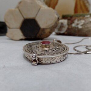 both the chain and pendant are stamped and tested at 925 sterling silver,chain is Serpentine and measures about 19 inches from end to end, the locket measures about 1.25 inches across,pendant opens and could be used to hold small objects or even a photo if cut to size, pendant has a pretty design both on the face and sides , the stone i am not sure of ,but it is darker redish pink with a smokey look,total weight is about 22 grams
