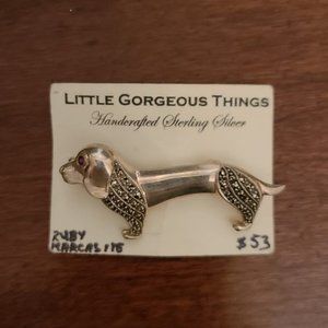 This adorable Dachshund is a tad over an inch, it has a tiny ruby eye and marcasite over the front and back legs. It's precious, especially if you love Dachshunds.