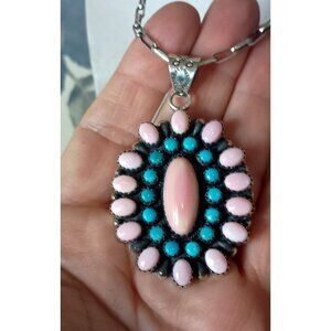 Sterling Silver Pink Conch Shell Turquoise Cluster Medallion Pendant Necklace