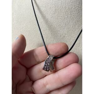 This beautiful sterling silver necklace features a delicate ribbon pendant adorned with pink cubic zirconia stones. It's a charming piece that adds a touch of elegance to any outfit. Perfect for everyday wear or special occasions.