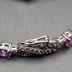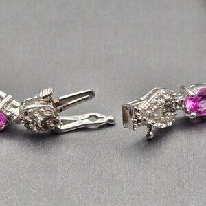 This elegant tennis bracelet features vibrant pink tourmaline gemstones paired with clear quartz accents, all set in high-quality 925 sterling silver. The piece is marked “SUN,” indicating craftsmanship from a reputable manufacturer known for durable, well-set designs. With its classic silhouette and sparkling stones, this bracelet is perfect for collectors, gift-givers, or anyone seeking timeless sophistication.