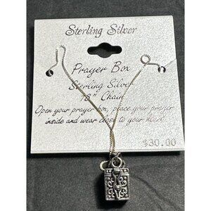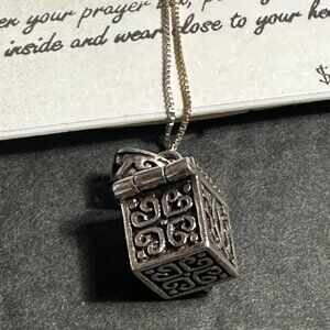 This sterling silver prayer box necklace is an elegant accessory for any wardrobe. Its intricate design and secure chain offer both style and functionality.
