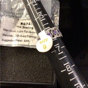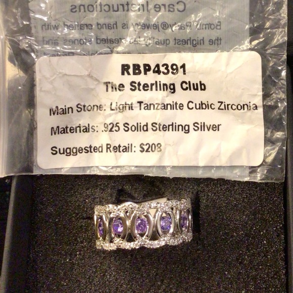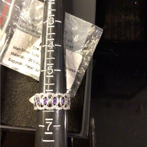 This ring is sterling silver. .925 with beautiful purple stones. And cubic zirconia. Size 6