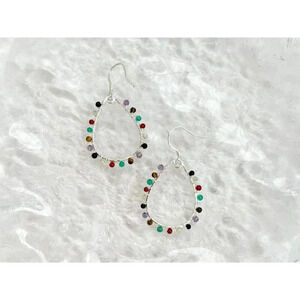 Sterling silver rainbow multi color oval teardrop hoop earrings. The silver hoop is lined with multi colored gemstones that are circular. Ear wire backing. Marked as 925 and tested positive as such. Lightweight, gorgeous colors and elegant. The stones are muilti color quartz.