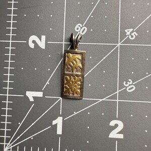 This artisan-crafted rectangle pendant showcases a two-toned design featuring sterling silver and gold accents. The turtle and floral motif offers a nature-inspired aesthetic and elegant simplicity.