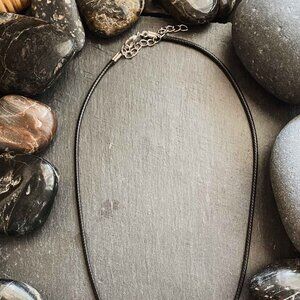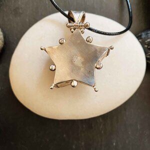 Pink Rhodonite star with a Garnet in the center. Housed in a sterling silver star on a black cord.