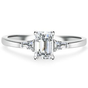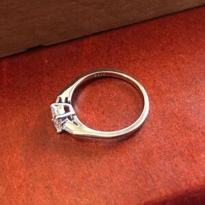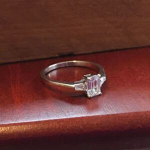 18K White Gold Plated 925 Sterling Silver Emerald Step Cut Baguette CZ Scratched Band Measures about a US ring size 6.25. Clear, cubic zirconia stones. Features two trapezoid-cut stones on the sides of the center stone. The band is marked S925. Weighs about 1.8g. The stone is approximately .8 CT. It is in fair condition with flaws. The back of the band is scratched and missing the shiny white gold plating. This stunning ring is made of 925 sterling silver with 18 karat white gold plating, and features three beautiful cubic zirconia baguette stones in the center. The ring has a stylish cocktail design and is a size 6.25, perfect for any occasion. The emerald-shaped stones are clear and colorless, and are surrounded by a silver band. This ring is ideal for those who love jewelry at an affordable price.