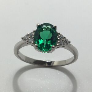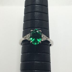 925 Sterling Silver Green Lab Created Cubic Zirconia Simulated Emerald Ring Size 7 Rhodium plated (platinum family metal) 925 sterling silver. The total weight is approximately 1.68 grams. Features a green 6x8 mm oval cut stone. The side stones are round, clear, cubic zirconias. In good condition, however theres a dark spot on the inside of the band.