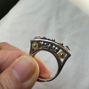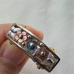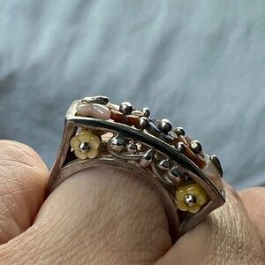 Vintage ring I purchased while cruising in the Mediterranean. Unfortunately it wasn't really my style and I ended up only wearing it one or twice. Hopefully someone else can make more use of it. It's sterling silver with multi-colored pastel enameled flowers. Size 5.