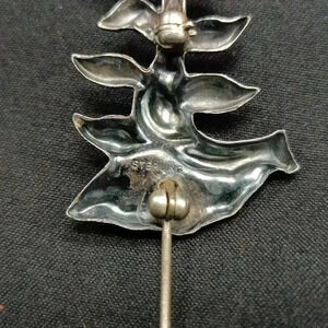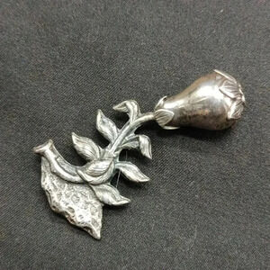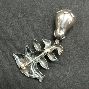 Beautifully detailed piece featuring a 360 degree sculpted silver rosehip. Sterling mark pictured as well as size.