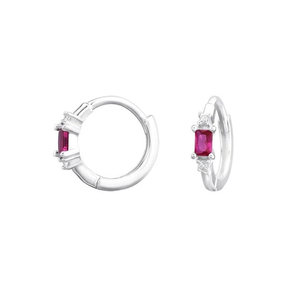 Timeless with a vibrant twist, these 11mm sterling silver huggie hoops feature a ruby baguette centerpiece flanked by delicate white stones for extra brilliance.