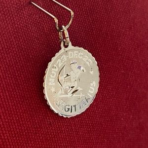 A shiny sterling silver zodiac charm depicting Sagittarius, the Archer, with his bow in hand & his arrow at his knee. SAGITTARIUS is printed on the bottom w/the relevant dates of birth at the top, in this case, "NOV 23 - DEC 22". This is a smaller charm, measurements/size shown in photos 4-6, hovering just between the size of a dime & a penny. The sterling stamp is on the jump ring, shown in photo 3. Make unknown. Shows some light wear, with a nice, shiny back for engraving a special message!