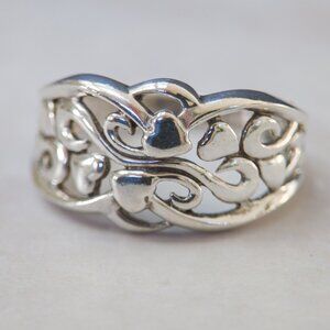 A sterling silver band with flowing openwork scrolls and softly rounded hearts woven through the design. The pattern has a sculptural, almost botanical rhythm — sweet without being overly sentimental. Finished in bright polish with subtle oxidation for depth, it’s a solid everyday piece with artisan character.