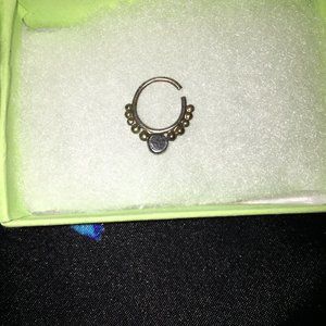 I bought this at a local shop to use as a cartilage earring, and it was the wrong gauge. Never worn, it will serve as a gorgeous septum ring when it is worn as it was intended to be! X) Also, sterling silver for sensitive skin.