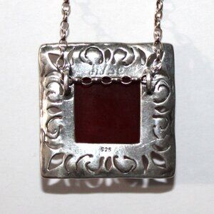 Sterling silver bohemian carnelian necklace by designer Shablool Didae. Pendant is square shaped with a larger square shaped faceted carnelian stone.