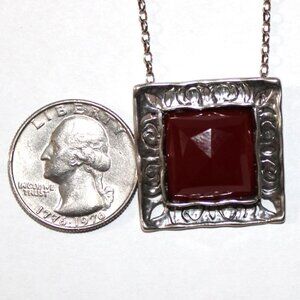 Sterling silver bohemian carnelian necklace by designer Shablool Didae. Pendant is square shaped with a larger square shaped faceted carnelian stone.