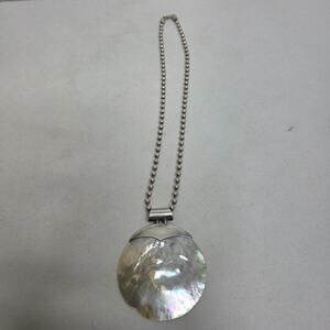 This is a beautiful sterling silver necklace featuring a Mother of Pearl pendant. The necklace is signed AZ and is stamped 925 for sterling silver. It was made in Italy and is in excellent condition. Perfect for any occasion!