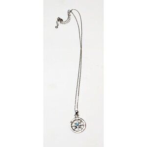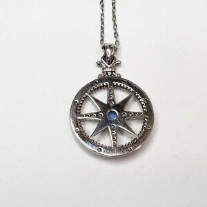 This is a pretty sterling silver compass necklace set with sparkling cubic zirconia and a simulated opal in the center. The pendant is unmarked, but tested as sterling silver.